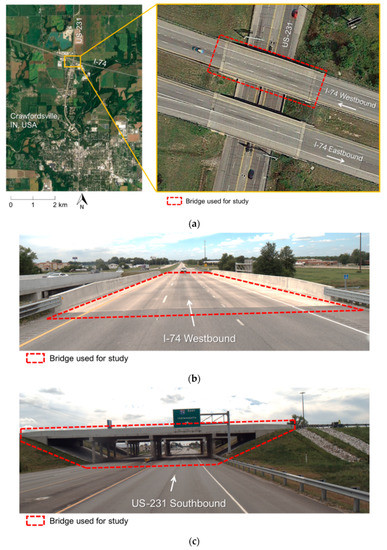 Study site: (a) the westbound bridge at the intersection of the I-74 and US-231 near Crawfordsville in Indiana, USA (aerial photo adapted from Google Earth images), (b) image of the bridge captured by PWMMS-HA while driving westbound on the I-74, and (c) side view of the bridge captured by PWMMS-HA while driving southbound on the US-231.