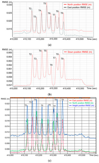 Global navigation satellite system/inertial navigation system (GNSS/INS) position accuracy charts for the (a) PWMMS-HA (north and east positions), (b) PWMMS-HA (down position), and (c) PWMMS-UHA vehicles. The highlighted eight peaks correspond to the eight southbound and northbound tracks (Tracks T2–T9) on the US-231 below the bridge, where suboptimal position accuracy can be observed.