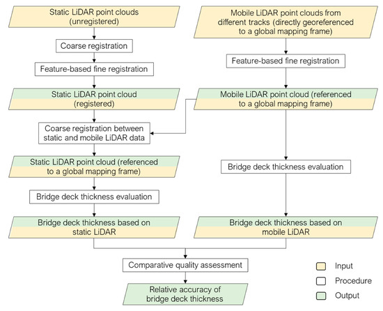 Modern remote sensing techniques provide promising non-contact alternatives for during- and post-construction bridge evaluation and inspection. Prior research has established principles and procedures for using unmanned aerial vehicle (UAV) imagery for bridge visual inspection and 3D information reconstruction [5,6,7,8,9]. Moreover, with several protection mechanisms, UAVs can maneuver at a close proximity to the bridge and even perform contact inspection tasks [10,11,12]. In contrast to imaging sensors, light detection and ranging (LiDAR) provides direct 3D measurements that can be used for quantitative evaluation. Terrestrial laser scanners (TLSs) can acquire high-resolution point clouds with millimeter-level precision, deemed as the gold standard in construction management and infrastructure monitoring. However, the time and labor required for data acquisition and post-processing increase significantly for a large site. The scanner might have to be set up within the driving lane to acquire sufficient point density along the structure, which in turn would affect traffic flow. Therefore, monitoring large-sized infrastructure using TLSs might not be practical and/or scalable. Mobile LiDAR mapping systems (MLMSs) facilitate efficient field surveys that can cover large areas with a minimal impact on traffic flow. For MLMSs, direct georeferencing, i.e., trajectory information provided by the onboard global navigation satellite system/inertial navigation system (GNSS/INS) unit, is typically adopted to reconstruct point clouds in a common reference/mapping frame. Point cloud quality therefore depends on the ranging accuracy of LiDAR units, the grade of the onboard GNSS/INS unit, and the reliability of the system calibration procedure. Centimeter-level positional accuracy can be expected if the quality of derived georeferencing data from the GNSS/INS unit and system calibration parameters are guaranteed. However, intermittent access to a GNSS signal and issues pertaining to system calibration cloud results in discrepancy of more than several centimeters between point clouds from different drive runs/flight lines. In this case, registration is required to fine-tune the point cloud alignment.