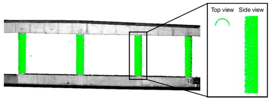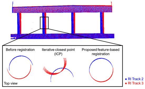 The linearized mathematical model corresponding to Equations (4)–(6) can be written as in Equation (7), which is commonly known as the Gauss–Helmert model [84]. Here, is the discrepancy vector arising from the linearization process; is the vector of random noise contaminating the point cloud coordinates in the different scans/tracks, which follows a stochastic distribution with a zero mean and a variance–covariance matrix of , with representing the a priori variance factor and the weight matrix, , depending on the specifications of the data acquisition system; and is the vector of unknown parameters (including transformation and feature parameters). The matrices and are composed of the partial derivatives of the models in Equations (4)–(6) with respect to the unknown parameters and point cloud coordinates, respectively. For a planar or linear feature, the respective matrix is rank-deficient, which can be deduced by analyzing the effective contribution of Equations (4) and (5) towards the overall redundancy. Although a point on a planar feature provides three equations, it only has a net contribution of one towards the redundancy—corresponding to the minimization of normal distance to the plane. For linear features, the three equations have a net contribution of two towards the redundancy—corresponding to the minimization of normal distance to the linear feature. Lastly, a point on a cylindrical feature provides a net contribution of one towards the redundancy. In order to ensure that the resulting normal matrix is full-rank and that the transformation and feature parameters can be reliably estimated, it is critical to have features with different orientations over the area of interest. The solution vector of the LSA model can be written as per Equation (8), where denotes the Moore–Penrose pseudoinverse that has to be used to compensate for the rank deficiency of the matrix. The residuals, , are given in Equation (9). The a posteriori variance factor, , can be computed using Equation (10), where is the number of unknown parameters. The variance–covariance matrix of estimated parameters is given in Equation (11). Interested readers can refer to Ravi and Habib [85] for more details regarding LSA with a rank-deficient weight matrix. Figure 10 presents a sample registration result using the ICP and proposed feature-based registration approach. The point clouds were acquired from two tracks in opposite driving directions, and thus capture different sides of the bridge piers. While the ICP incorrectly aligned the two sides of the piers, the proposed approach produced superior results by fitting conjugate features to a single cylinder model: