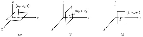 Different options for representing planar features showing the normal vectors to the planes (defined by the eigenvector corresponding to the smallest eigenvalue) that are mainly along the (a) Z-axis (i.e., the eigenvector component along the Z-axis is larger than those along the X and Y axes), (b) Y-axis (i.e., the eigenvector component along the Y-axis is larger than those along the X and Z axes), and (c) X-axis (i.e., the eigenvector component along the X-axis is larger than those along the Y and Z axes).