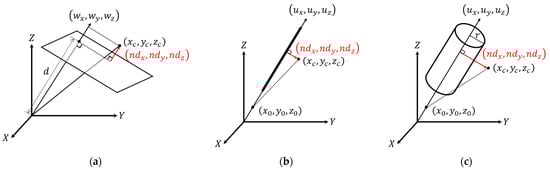 Schematic illustration of the normal distance vector components that are minimized using the (a) plane-fitting model, (b) 3D line-fitting model, and (c) cylinder-fitting model.