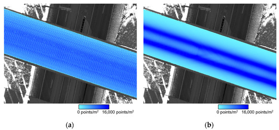 Point density over the bridge deck from one track (track T1) for: (a) PWMMS-HA and (b) PWMMS-UHA.