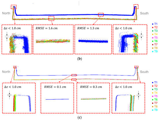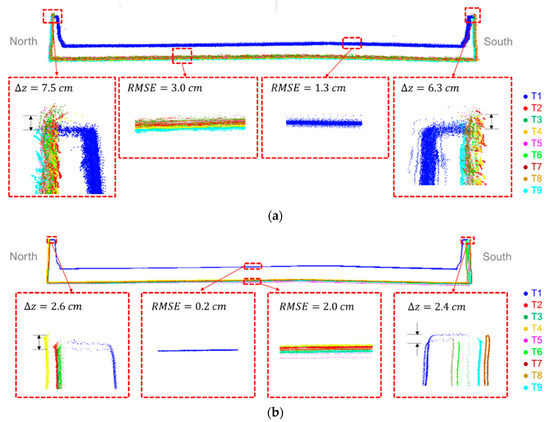 Sample cross-sectional profile of the bridge deck showing the point cloud alignment before registration for the (a) PWMMS-HA and (b) PWMMS-UHA datasets. Both datasets have nine tracks (T1 is above the bridge and T2–T9 are below the bridge).