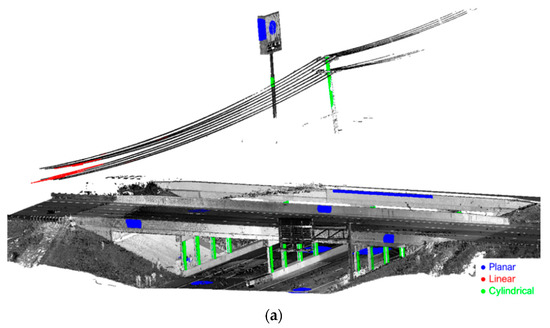 The proposed feature extraction strategy is adapted from the multi-class simultaneous segmentation proposed by Habib and Lin [82]. First, a seed point is manually identified in the point cloud from the individual scans/tracks. If the point clouds are roughly aligned, the same seed point can be used to extract the feature from all scans/tracks. Otherwise, the user will need to select the seed point for each scan/track. Next, a seed region is established by identifying the neighboring points of the seed point. Dimensionality analysis [83] is then performed to classify the seed region as a linear/cylindrical, planar, or rough feature. Only planar, linear, and cylindrical seed regions are considered for feature extraction. The parameters of the best-fitting plane/line/cylinder, which will be discussed later in this section, are estimated via an iterative model fitting and outlier removal. More specifically, model parameters are estimated in an iterative manner while assigning lower weights to points that are farther from the fitted surface in the previous iteration. Next, neighboring points that belong to the current feature are augmented through region growing. Concretely, neighboring points whose normal distance are smaller than a multiplication factor times the root-mean-square error (RMSE) of the fitted model are added. The output of the feature extraction includes the segmented points (an example is shown in Figure 6) and parameters describing the respective feature model—both are required in the LSA registration and model parameterization.