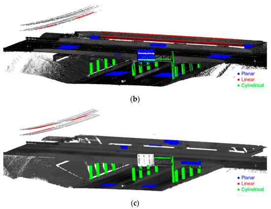 Extracted planar/linear/cylindrical features (in blue/red/green, respectively) for the registration of (a) TLS, (b) PWMMS-HA, and (c) PWMMS-UHA point clouds.