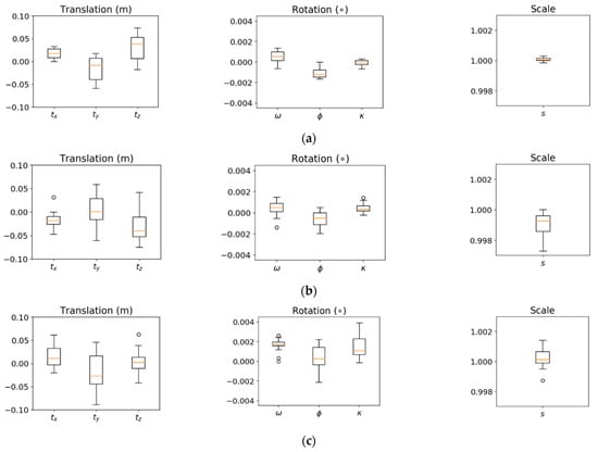 Box and whisker plots of the fine-registration transformation parameters for the (a) TLS, (b) PWMMS-HA, and (c) PWMMS-UHA datasets.