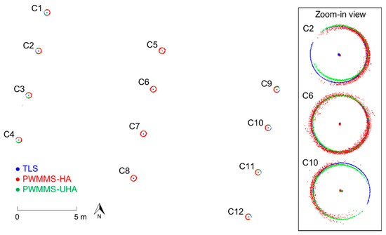 One of the advantages of the proposed alignment strategy is the production of a parametric model representation of the registration primitives, which could be used for bridge monitoring over time (e.g., the cylindrical columns supporting the bridge). To show the comparative performance of TLS and MLMSs in terms of the similarity of derived post-registration parametric models for cylindrical features, Figure 16 depicts a top view of the twelve columns supporting the I-74 bridge together with their axes. As evident from the figure, the cylindrical columns from different sensing modalities are well-aligned. Table 3 reports the estimated radii of the twelve columns where the estimates from different systems are in agreement within the 1 cm range. Moreover, the relative planimetric discrepancies between the TLS and MLMS datasets were evaluated using the derived horizontal locations of the cylindrical columns. The results show that the relative horizontal locations are compatible within a 1 cm range. Once again, these values are in agreement with the post-registration estimates of the square root of a posteriori variance factors reported earlier.
