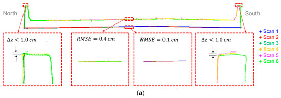 As another verification of the impact of the fine registration of the MLMS point clouds, a cross-section of the bridge deck (at the same location shown in Figure 13) that was extracted from the point is depicted in Figure 17, where a significant improvement can be observed. Zoomed-in areas at the barrier rails show that the above-bridge and below-bridge tracks/scans are in agreement within a 1 cm range for all systems. Moreover, zoomed-in areas at the top and bottom surfaces of the bridge deck verify that the point clouds from different tracks/scans are in good agreement along the vertical direction. According to the plane-fitting RMSE shown in Figure 17, the precision of the point cloud from PWMMS-HA is in the ±1.5 cm range, which is better than the expected value of ±4 cm. Moreover, both PWMMS-UHA and TLS point clouds achieve millimeter-level precision (i.e., in the ±0.3 cm and ±0.4 cm range, respectively). In summary, the results show that the proposed feature-based fine registration can effectively minimize the impact of trajectory and system calibration errors, and thus improve the point cloud quality.