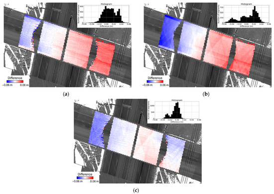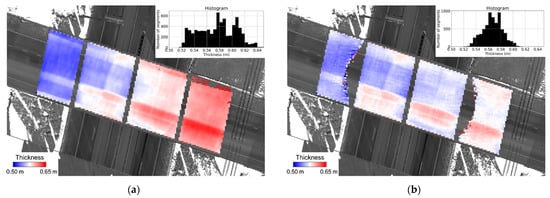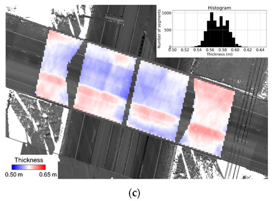 Having examined the point cloud alignment, bridge deck thickness was then evaluated using the proposed surface segment-based approach. The segment size was set to 30 cm × 30 cm. The thresholds and were defined as three times the square root of a posteriori variance factor after registration and 50% of it, respectively. The thickness estimates are visualized as a heat map and shown in Figure 18. The spatial patterns from the three datasets are similar as they all indicate a smaller thickness value over the right two lanes towards the west side of the bridge.