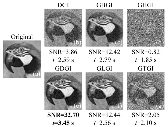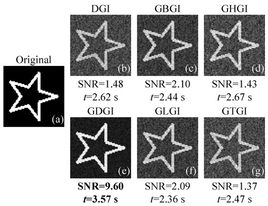 Figure 3a shows a grayscale image labelled “02”, whose gray value range is [0, 1]. With the same number of measurements, the above algorithms are executed again. Here, we set . The results are presented in Figure 3b–g. The SNR and calculation time of the DGI is 3.86 and 2.59 s, respectively. In the recovered image of the DGI, the contour of the object is recognizable, but the background noise is messy and the detailed information is missing. As we can see, the GDGI acquires the best performance, with an SNR value of up to 32.70. The image retrieved by the GDGI contains only a small amount of noise and shows a great ability to resolve the details. In addition, the SNRs of the GBGI and GLGI are more than three times that of the DGI, while the GHGI’s performance was the worst (as it hardly acquires any useful object information) among these GGI variants due to the aforementioned HGI restrictions. The calculation time of the above methods is very close, with all less than 4 s, which further indicates that the GDGI can obtain high-quality reconstructed images, with the noise being well-suppressed at the expense of a negligible increase in computing time.