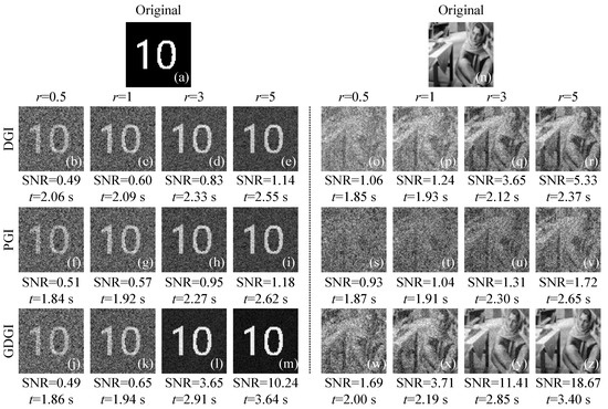 Next, to verify the universality and effectiveness of our algorithm, we tested another binary image and a grayscale image whose gray value range is [0, 1], marked as “03” and “04”, respectively. Figure 5 shows the original images and the corresponding imaging results of the DGI, PGI and GDGI with different sampling rates r (defined as the ratio of the number of measurements to the total number of image pixels). As can be seen from Figure 5b–m,o–z, when r = 0.5, the image quality of the PGI is slightly better than those of the DGI and GDGI for the image “03”, while the image quality of the GDGI is 0.59 and 0.82 times higher than those of the DGI and PGI for the image “04”. When r = 1, the image quality of the GDGI is 0.08 and 0.14 times higher than those of the DGI and PGI for the image “03”, and 1.99 and 2.57 times higher than those of the DGI and PGI for the image “04”. When r = 3 and 5, the imaging performance of the GDGI is much better than those of the DGI and PGI. Therefore, it can be inferred that, with the increase in sampling rate r, the improvement in image quality will be more significant. In addition, since our algorithm does not require preprocessing or optimizing of the measurement data, the use of a gradient-descent-like method can also fully improve the utilization of data, thereby greatly saving additional computational overhead. Here, the average running time of the GDGI is only 1.19 and 1.18 times those of the DGI or PGI, respectively, which means that a significant improvement in imaging quality can be achieved without much running time increment, i.e., our scheme has a relatively high return-to-investment ratio. Besides, through this simulation, it also demonstrates that our algorithm works well for different types of images.