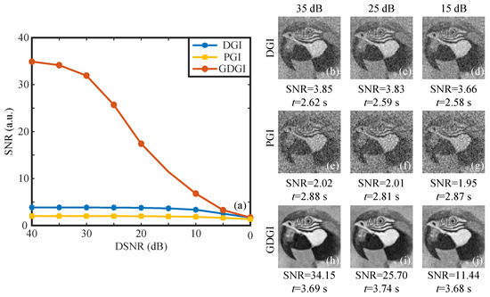 In the following, we performed additional numerical simulations to test the robustness of the GDGI against noise. Taking the image “02” as an example, we further added white Gaussian noise to the bucket value to simulate the noisy measurements. Then, we calculated the SNRs of reconstructed images under different detection signal-to-noise ratios (DSNRs), i.e., the power ratio of the signal to the measurement noise, which can be expressed as [29], where and denote the variances of the bucket values and measurement noise, respectively. As shown in Figure 6a, when the Gaussian random noise with different variances is added to the bucket signal, the SNRs of images recovered by the DGI, PGI and GDGI decrease with the decrease in the DSNR. It can be clearly seen from the curves that when the DSNR is greater than 5 dB, the imaging performance of the GDGI is significantly better than those of the DGI and PGI; when the DSNR is less than 5 dB, the SNRs of these three methods become closer, but the SNRs of the GDGI are still slightly higher than those of the DGI and PGI. This is because the statistical averaging of the intensity correlation is accompanied by reconstruction noise. The lower the DSNR, the harsher the measurement condition and the more difficult it is to distinguish the useful signal from the noise, which leads to a larger reconstruction noise and makes it more difficult to recognize the object part in the image. In ultra-low DSNR conditions, all algorithms including convex optimization will tend to fail. As shown in Figure 6b–j, we made some comparisons among the DGI, PGI and GDGI, with the DSNR changing from 35 dB to 15 dB. When DSNR = 35 dB, 25 dB and 15 dB, the SNRs of the GDGI are 8.87, 6.71 and 3.13 times those of the DGI, and are 16.91, 12.79, 5.87 times those of the PGI, showing that our algorithm has a good anti-noise ability compared with the traditional GI algorithm under noisy measurements.