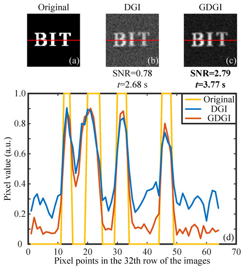 For the imaging experiments of a binary object, we encoded a binary image “BIT” onto as the original object image (see Figure 8a), then presented the reconstructed images with (as an example) in Figure 8b,c. The SNRs of the DGI and GDGI are 0.78 and 2.79, respectively. It is obvious that the latter is 3.58 times the former, but the calculation time of the latter is only 3.77 s, consistent with the aforementioned simulation results. Furthermore, the visibility of the GDGI is much better than that of the DGI. To make a more intuitive comparison of the reconstructed images, we plotted the curves of the grayscale values in the 32th row (consisting of 64 pixels) of the original image and restored images (marked by the red lines in the Figure 8a–c. It can be clearly seen from Figure 8d that our GDGI can significantly reduce the background noise and improve the contrast compared with traditional DGI, thus dramatically improving the visibility. Without loss of generality, this also indicates that our GGI scheme can efficiently improve the SNRs of GI reconstructions.