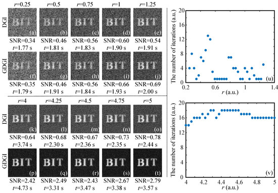 Next, the images of the DGI and GDGI were reconstruced using different sampling rates (see the left half of Figure 9). Above the dotted line on the left half of the graph, we increased the sampling rate r from 0.25 to 1.25, step by 0.25, and below the dotted line, we made r change from 4 to 5, also step by 0.25. It is easy to see from Figure 9a–t that when r is smaller than 1, the GGI benefits are small, and when r is larger than 1, the gains become increasingly apparent. The reason for this is that when the measurement data are relatively limited, it is difficult for a finite number of iterations to maximize the performance gains; when the measurement data are rich, these iterations can effectively take advantage of the correlation within the data to suppress noise and improve image quality. To further demonstrate the performance of the proposed method, the relationship between the number of iterations it takes for the algorithm to terminate and the sampling rate is given on the right half of Figure 9. As shown in Figure 9u, when r is between 0.25 and 1.25, most of the iteration numbers required for the algorithm to converge are lower than 8. In this case, the GGI fails to obtain effective performance gains. However, when r is between 4∼5, the number of iterations required for convergence is about 16, as shown in Figure 9v. In this situation, the iterations gradually approach the position of the optimal solution, and thus the image quality is significantly improved. Therefore, it can be concluded that, in our algorithm, the image quality can be effectively improved with a limited number of iterations without any preprocessing or optimization.