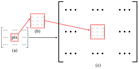 In the experiment, we use the image displayed on as the object. The DMD is composed of millions of micromirrors (pixels), each of which orientates with respect to the normal direction of the working plane, corresponding to two states (1 or 0). Thus, the matrix encoded onto the DMD should be binary, consisting of 1 and 0. To our knowledge, to display grayscale objects, the pulse-width modulation (PWM) strategy, which exchanges time-pulse width for grayscale level, is generally used. Since the DMD should sequentially switch multiple binary patterns for each grayscale image’s display, the higher the grayscale level, the more time the PWM takes. Here, we chose to apply another method called Floyd–Steinberg error diffusion dithering [41] to convert the grayscale image to binary image. As shown in Figure 11, to reconstruct a grayscale image of , we need to apply upsampling to this image and set its each pixel as a pixel-unit “pix” consisting of pixels (i.e., a grayscale pixel-unit occupies 144 mircormirrors in total with a gray value ranging from 0 to 144). The pixels are randomly lit up (set to 1) in a pixel-unit; the number of bright (1) pixels indicates the gray value of this pixel-unit. Here, for a grayscale image’s display, a matrix of actual pixels will be loaded onto .