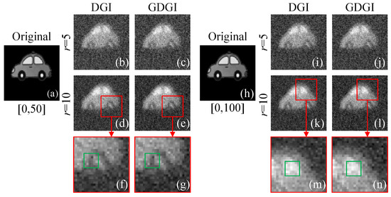 In this experiment, we encoded two grayscale images onto “car” (see Figure 12a,h) with a grayscale range of [0, 50] and [0, 100], respectively. Their experimental results using the DGI and GDGI under the sampling rate r = 5 and 10 were given in Figure 12b–e,i–l. It is obvious that the reconstruction results of r = 10 are better than those of r = 5, and the reconstructed details for a larger grayscale range are richer. To compare the details of the reconstructed images more intuitively, we enlarged the image regions within the red rectangles of Figure 12d–e,k–l, and drew green rectangles in the corresponding areas for more detailed observation, as shown in Figure 12f–g,m–n. Through subtle comparisons, we found that the GDGI will achieve a higher visibility than the DGI, but the improvement effects are not obvious. In this experiment, the measured bucket (single-pixel) signal is accompanied by a lot of noise, the DSNR is very low, and the GDGI algorithm terminates after only 1∼6 iterations; thus, the gain of the GDGI is small. The acquisition of high-quality images under low DSNR conditions is a tough problem for GI, and this will be the focus of our future research.