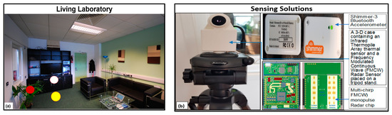 The experimental setup involved the use of multiple sensors to record SPAREs in a laboratory living room that mimics a real-world living room. They included (i) one Frequency Modulated Continuous Wave (FMCW) radar sensor, (ii) one Multi-Chirp Frequency Modulated Continuous Wave Mono-pulse (MC-FMCW-M) radar sensor, (iii) two ITA-32 sensors, and (iv) two Shimmer-3 accelerometer (S3BA) SSs. The S3BAs were used for ground truth measurement of velocity. While the radar and thermal sensors were mounted on tripod stands and placed for side and frontal views of the ankles, the two S3BAs were attached to the metatarsal to record the acceleration of each foot in the X, Y, and Z directions. The rationale for taking measurements from the front and side views was to avoid the effects of occlusion. The rationale for using multiple sensors was to allow for complementary monitoring, redundancy, and cross-validation of measurements. The setting of the study, including the Living Lab in which the study was conducted, the physical location of the participants, and the SSs are presented in Figure 1.