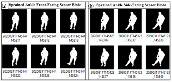 Instances of right-ankle and foot dorsiflexion, plantarflexion, eversion, and inversion as recorded by ITA-32 thermal sensors: (a) thermal blobs from the front-facing camera and (b) thermal blobs from the side-facing camera.