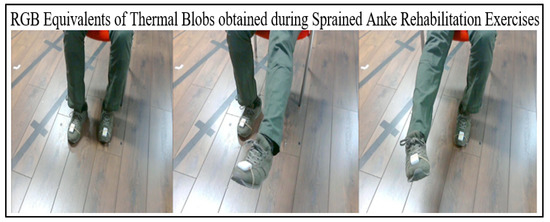 RGB equivalents of the thermal images recorded during sprained ankle rehabilitation exercise. A Shimmer-3 accelerometer is worn on metatarsals (on both legs) for ground-truth velocity measurements.
