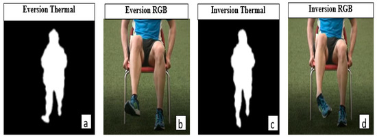 Instances of eversion and inversion of the ankle as presented by RGB and ITA-32 thermal sensors. (a) An instance of eversion by an ITA-32 thermal sensor, (b) an instance of eversion by an RGB camera, (c) an instance of inversion by an ITA-32 thermal sensor, and (d) an instance of inversion by an RGB camera.