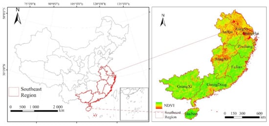 Study area including eight southeast provinces and Shanghai. The figure on the left shows the location of the study area and the right figure shows the location image of the study area based on NDVI.