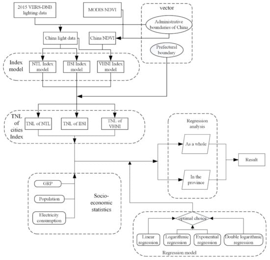 Firstly, the nighttime light data and NDVI data of China were obtained by using the preprocessed light data and MODIS NDVI data after clipping the administrative boundary of China. Then, the administrative boundary of prefecture-level cities was cut out and processed to obtain the lighting data of three models, and the TNL values of the lighting data of three models in different cities were statistically obtained. The flow chart is shown in Figure 2.