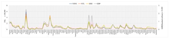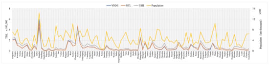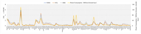 In the linear regression analysis results, the index with the best comprehensive performance of the three index fitting results is GDP, and its determination coefficient is the maximum in the linear fitting of different indices to the same index, which is 0.8466 for NTL, 0.7746 for IISI and 0.8632 for VHNI, respectively. The indicator with the worst fitting performance was the population, and the determination coefficient was the minimum of the three indicators, which were 0.2488 for NTL, 0.3015 for IISI and 0.2642 for VHNI. In the fitting with GDP as the dependent variable and light index as the independent variable, light index VHNI performed best, of linear regression was 0.8632, higher than 0.8466 of NTL, and IISI performed worst, was 0.7746. In the fitting of population size, the linear relationship between TNL and population size of each index is weak, and the value of is generally low. The of the three indices is about 0.30, but IISI is more outstanding, for which is 0.3015, which is greater than the 0.2488 for NTL and 0.2642 for VHNI. In the fitting of power consumption, IISI has the worst performance with of 0.6404, while VHNI has the best performance with of 0.7824, which is larger than 0.752 of NTL. As can be seen from Table 3, in the fitting of GDP and power consumption, the determination coefficient of VHNI has the highest value and the strongest linear relationship, which is greater than the other two indices.