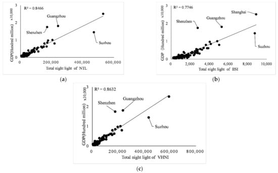 (a–c) Linear fitting relationships between NTL, IISI, VHNI and GDP, respectively.