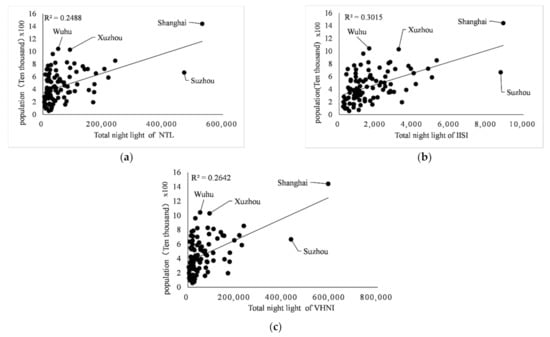 (a–c) Linear fitting relationships between NTL, IISI, VHNI and population respectively.