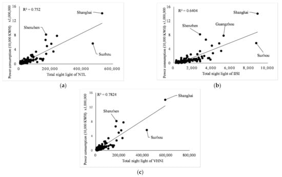 (a–c) Fitting relationships between NTL, IISI, VHNI and power consumption, respectively.