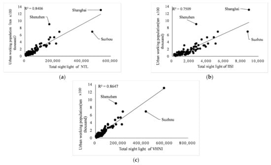 (a–c) Fitting relationships between NTL, IISI, VHNI and urban employed population respectively.