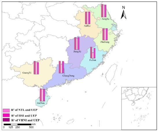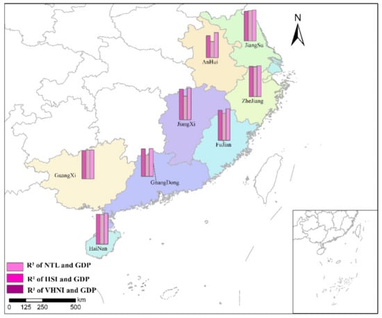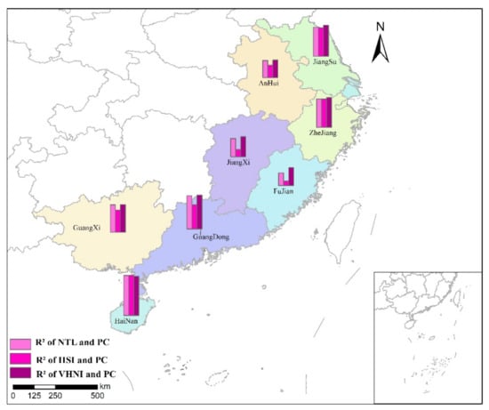 The vegetation information data used by VHNI is the most widely used normalized vegetation index (NDVI). Other vegetation indices, such as enhanced vegetation index (EVI), can reduce the influence of soil background and atmosphere on vegetation index. The ratio vegetation index (RVI), which is sensitive to vegetation in high vegetation coverage area, and the perpendicular vegetation index (PVI), which eliminates the influence of soil background, can be effectively replaced according to the vegetation coverage of the study area. The research area of this paper is southeast China, which is the most economically developed region in China. In the future, the research can be extended to other regions of China and even across the globe for verification. In addition, VHNI is only compared with NTL and IISI in this paper. Other indices can be added in future studies for comparison, analysis and induction, and VHNI can be improved.