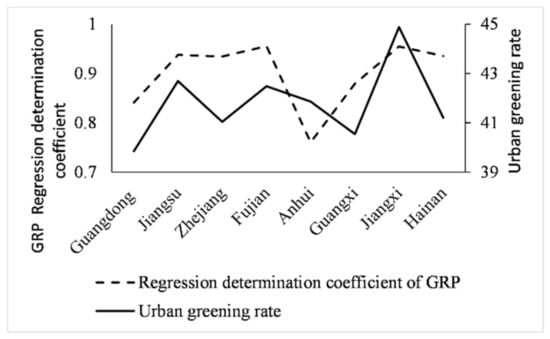 According to the China Urban Statistical Yearbook, the urban greening rates of Jiangxi and Fujian are 44.88% and 42.48% respectively, ranking first among provinces in southeast China, followed by Jiangsu and Zhejiang. In order to further explore the linear regression effect of VHNI and GDP, the regression is compared with the urban green rate, as shown in Figure 11. From the curve change of and urban greening rate, the trend of the two is basically the same in different provinces, so there is a certain correlation between them, and the correlation coefficient is 0.4312.