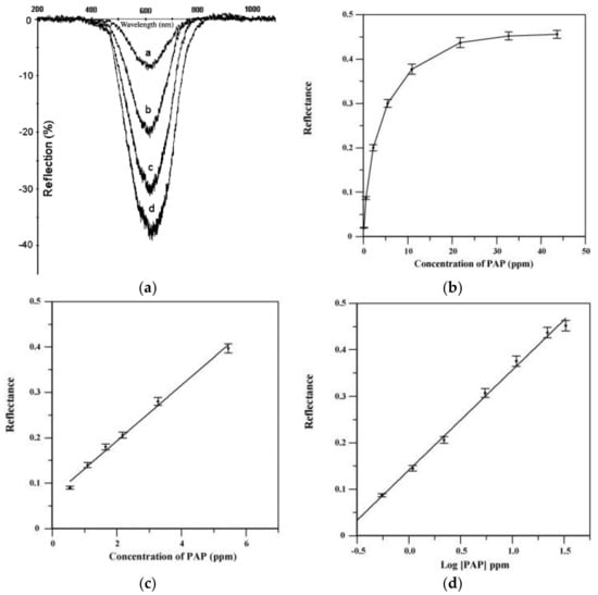 (a) Reflectance spectra of immobilized CAL4 before (Rf) and after (a–d) reaction with different concentrations of PAP, being 0.545 mg/L (curve a), 2.18 mg/L (curve b), 5.45 mg/L (curve c), and 10.9 mg/L (curve d). (b) Response curve to a wide range of PAP concentrations. The panels (c,d) show the linear and non-linear portions of the response curve. (Reprinted-adapted-with permission from []).