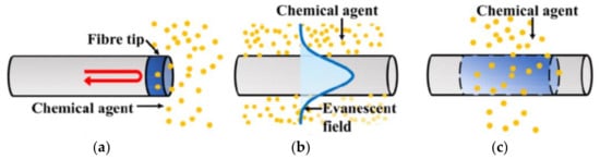 Basic sensing schemes for typical fiber-optic chemical sensors based on (a) fiber tip, (b) evanescent field sensing, and (c) simple transmission setup. (Reprinted from [] under Open Access conditions).