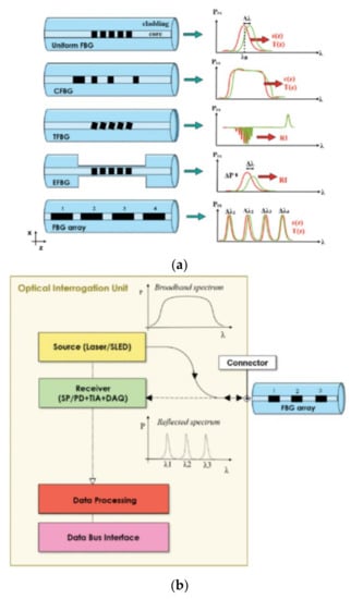 Another largely employed approach that uses optical fiber is represented by fiber Bragg gratings (FBGs) that nowadays are used for many applications in different fields by adopting one of the most common configurations, shown in Figure 6 [,].