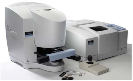 In Figure 8, a typical commercial instrument for FT-IR spectroscopy is reported. This system adopts a long-life source with proprietary hot-spot stabilization as a source, and it is equipped with two different detectors for the acquisition at macroscopic and microscopic levels. It allows the acquisition of infrared spectra in transmission and attenuated total reflection (ATR) mode for macroscopic samples. At the microscopic level, spectra can be acquired in transmission, reflectance, transflection, and micro-ATR collection geometry. The availability of all these different approaches makes FT-IR spectroscopy very versatile and suitable for all types of samples [].