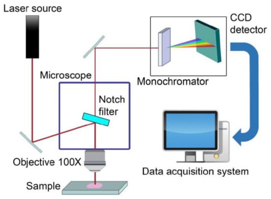 In Figure 9, a typical micro-Raman set-up is shown. Typical equipment for micro-Raman spectroscopy requires a laser source, a microscope objective to view the sample, focusing the laser beam on the sample and collecting the weak light from it in back-scattering geometry, a filtering system for rejecting the exciting light (Notch filter), a dispersive apparatus (monochromator), a high-sensitivity detector for the detection of the output signal (typically a nitrogen-cooled CCD), an electronic counting chain for the acquisition of the Raman signal, and a software for recording and processing Raman spectra. The adoption of confocal microscope stages allows the acquisition of appreciable Raman signals in experimental conditions of interest for phenolic compound sensing. See Ref. [] and references therein for additional information.