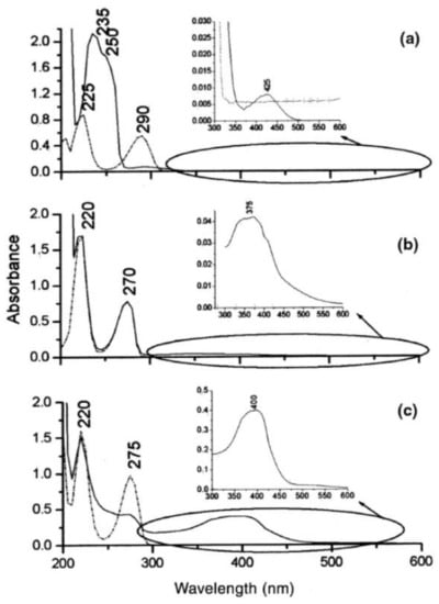 Experimental results obtained with an optical biosensor based on sol–gel immobilized laccase. (a) Absorption spectra of hydroquinone (dashed line) and laccase-reaction product (continuous line), (b) the same for resorcinol, (c) the same for catechol. In the different insets, the spectra in the 300–600 nm region. (Reprinted with permission from []).