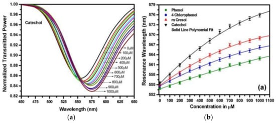 (a) Surface plasmon resonance spectra of a fiber-optic SPR probe for different concentrations of catechol, (b) Calibration curves obtained by measuring the variation in resonance wavelength for different concentrations of various phenol species. (Reprinted-adapted-with permission from []).