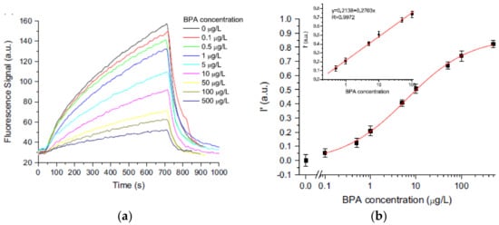 Long et al. [] presented a highly sensitive and selective immunosensor for BPA detection that takes advantage of evanescent wave fiber-optic sensor and microfluidic technology for developing an all-fiber optofluidic-based bioassay platform []. In Figure 13, representative results are reported. The changes in fluorescence signal related to different BPA concentrations are used for realizing the calibration curve that shows a linear range between 0.5 μg/L and 1.0 μg/L and an LOD of 0.06 μg/L. This value is particularly appealing when compared with ELISA and amperometric biosensor performances. The biosensor was also tested with BPA-spiked samples, and the recovered data and the relative standard deviations were between 90–120% and 3.8–9.1%, respectively. The authors use the developed biosensing device also for investigating the BPA leaching of polycarbonate (PC) bottles of different brands. In fact, the residual and degraded BPA in this kind of bottle may migrate into food, especially at elevated temperatures for long periods []. The presented results show that the risk of BPA leaching from PC bottles is a real problem, and this approach can give a sensitive, rapid, on-site, real-time detection of BPA leaching.