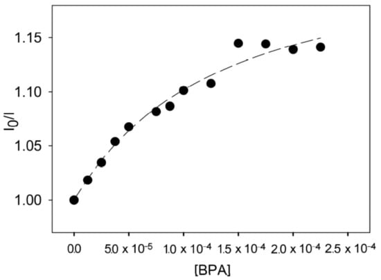 Calibration curve for different BPA concentration obtained by using the ratio of luminescence intensity of the [Ru (phen)2 L]2+ complex over luminescence intensity of the complex upon addition of increasing concentration. (Reprinted from [] under Open Access conditions).