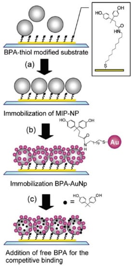 - Taguchi, Y.; Takano, E.; Takeuchi, T. SPR sensing of bisphenol A using molecularly imprinted nanoparticles immobilized on slab optical waveguide with consecutive parallel Au and Ag deposition bands coexistent with bisphenol A-immobilized Au nanoparticles. Langmuir 2012, 28, 7083–7088. [Google Scholar] [CrossRef]