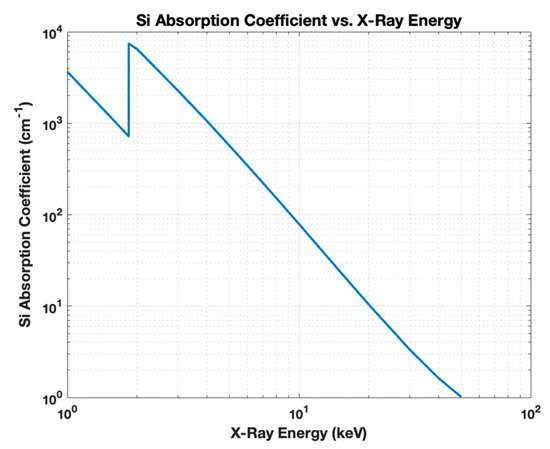 The absorption coefficient of Si vs. X-ray energy for 1–50 keV computed using the NIST database for Si [2].
