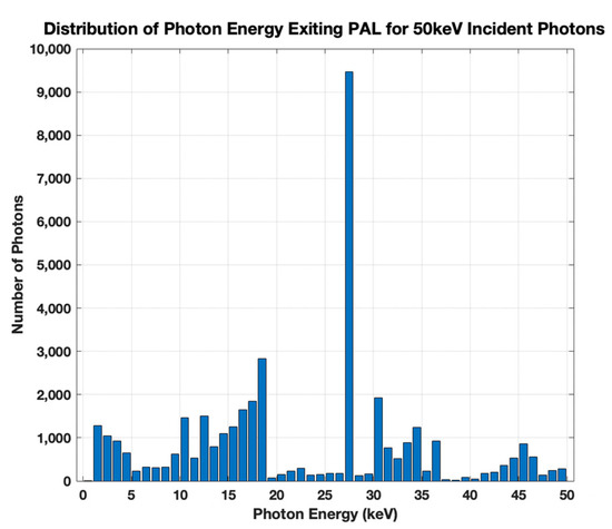 The simulation outputs the number of photons exiting the PAL in ΔE = 1 keV bins: 0–1 keV, 1–2 keV, etc. One example is illustrated in Figure 3 for 50 keV incident photons and 0.5-m thick PAL. The distinct peaks are attributed to be either characteristic X-rays or shell edges from Pb and Te. In particular, the most prominent peak at 27.5 keV corresponds to the KL2–KL3 transition for Te [2]. These down-converted photons will then enter the Si detector and either be absorbed or transmitted. The density of normal-incidence photons of energy E, P(L,Ε) absorbed in the Si layer of thickness L, can be calculated using Beer–Lambert’s law, [10]:
