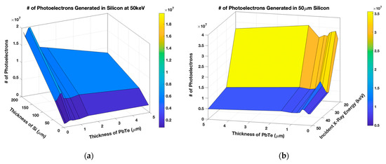 (a) The number of photoelectrons generated with 50 keV incident photons, 5–200 m Si, and 0.1–5 m PbTe. (b) The simulation using 20–50 keV photons, 50 m Si, and 0.1–5 μm PbTe.