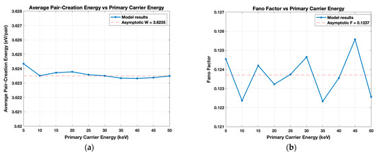 Cascade results as a function of 5–50 keV primary carrier energy. (a) The average pair-creation energy with asymptotic value ~3.63 eV/pair; (b) Fano Factor that fluctuates at about ~0.124.
