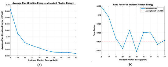 Full model results for 5–50-keV incident photon energy. (a) The average pair-creation energy that tends to ~3.63 eV/pair; (b) Fano Factor with an asymptotic value 0.124.