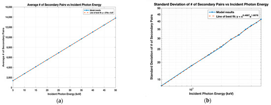 In addition to the W and F values, the distribution of and its corresponding standard deviation σ were found. is plotted in Figure 7a for 5–50 keV and depicts a linear relationship between and the incident photon’s energy, with the line of best fit being y = 276x − 5.87. Although not shown, a Gaussian fit was applied to the data at each energy level and the found were very consistent with the distribution for the cascade. Despite the distribution appearing to be Gaussian, Fraser et al. noted the asymmetry of the Gaussian peaks at lower energy levels, so was instead computed by rearranging the equation for F: . The model’s logarithmic results for in Figure 7b were fitted to a linear regression with the equation . The trend lines obtained for the full model were nearly identical to those for the cascade model; therefore, only the full model results are illustrated. Both trend lines may be used to predict and at particular energy levels.